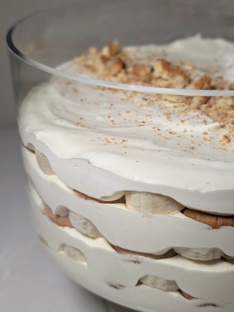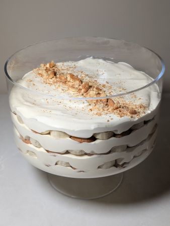 Reserve 2-3 vanilla wafers for garnish. Layer 1/4 of the pudding, 1/3 of the vanilla wafers, and 1-2 sliced bananas in that order inside a trifle dish or other (preferably clear) family-style serving bowl. Repeat ending with a layer of pudding, then garnish with crushed reserved cookies and bottom-of-the-bag crumbs.